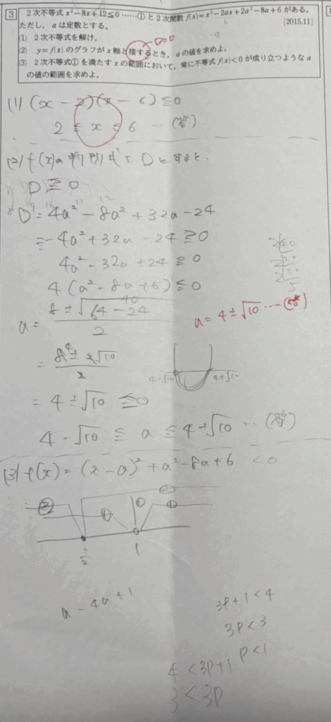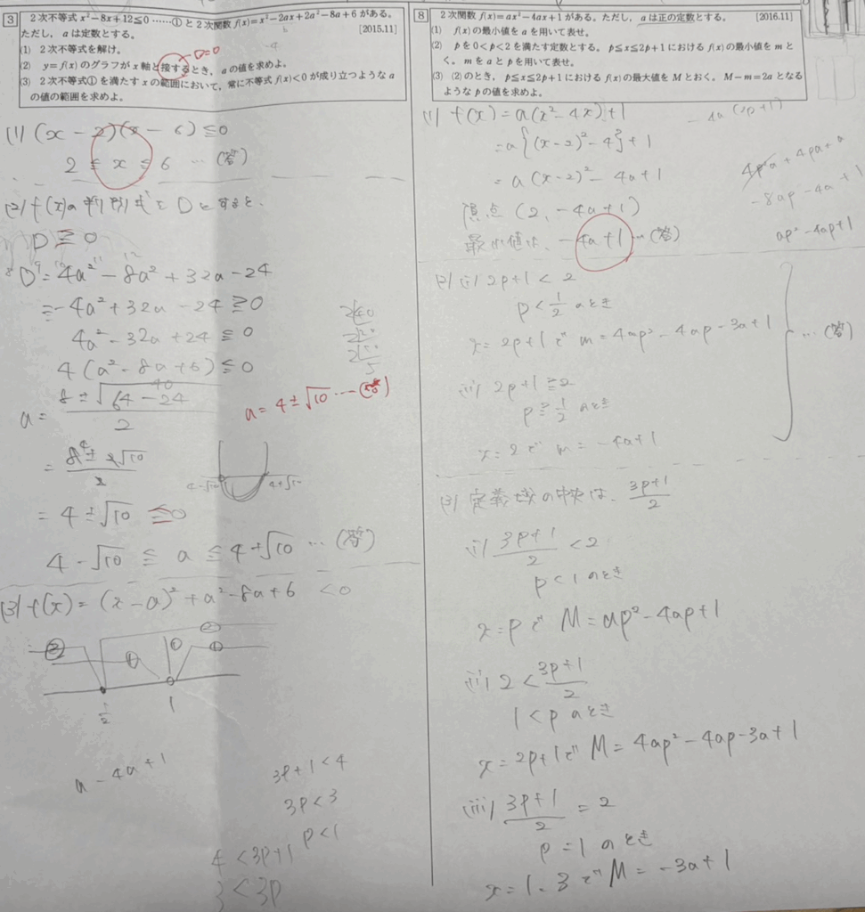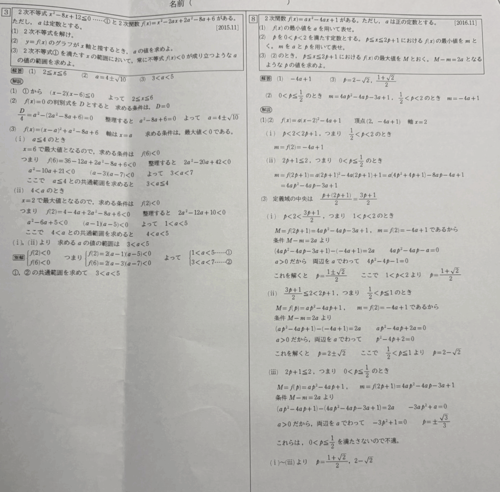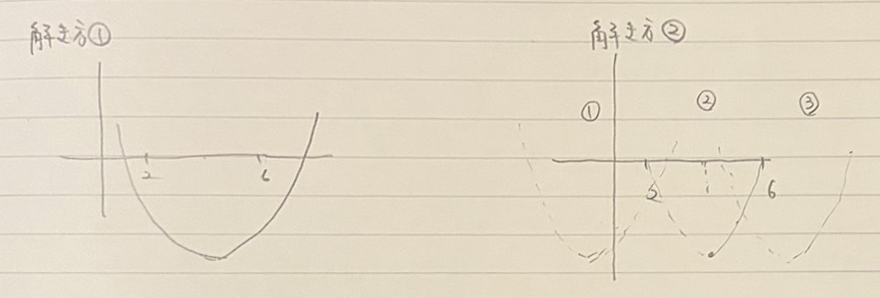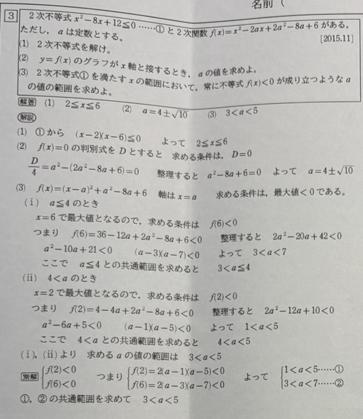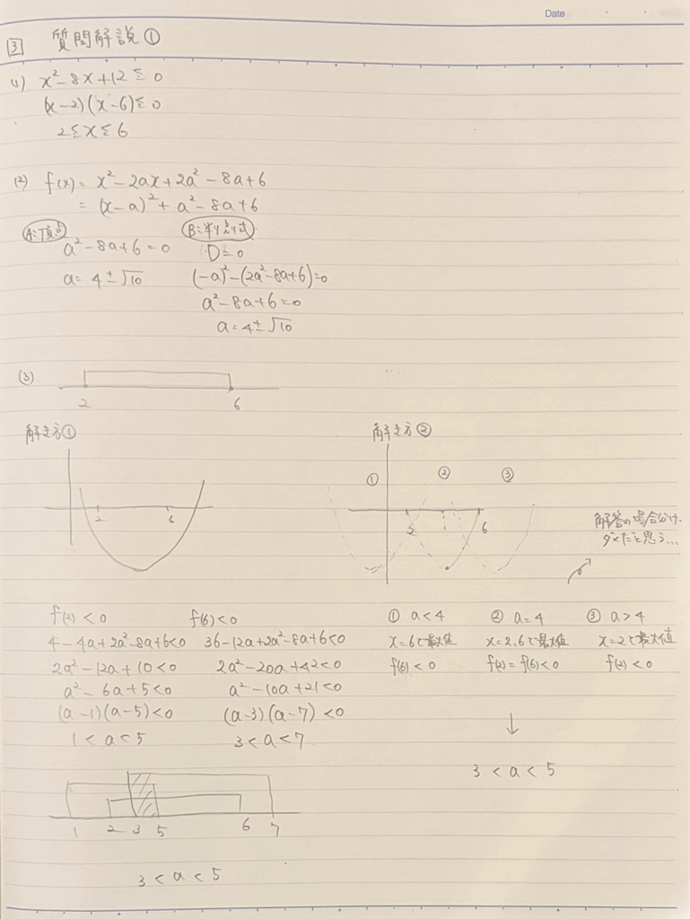 ノートに解いてみました。解答には別解としてのっているやり方を僕は楽なので採用していました。あと解答の場合分けはちょっと不完全なのでセオリーどおり3つに場合分けすべきと思ったのですが、どうですかね。。。