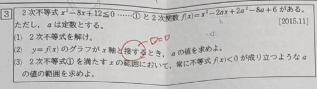 ・それから(2)はみんな判別式でやると思いますけど、実際は「A:頂点」と「B:判別式」の2つのやり方があることを理解しておいてください。結局やってることは同じですけど、問題集ではバラバラにでてきて、僕は「前は別のやり方じゃなかったっけ?」とか「どっち使えばいいんだ?」って混乱していました。結果どっちでもいいので、2つあることを整理して理解しておいてください。